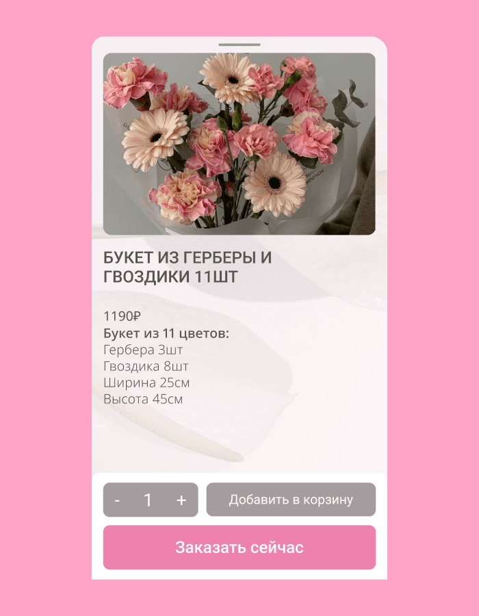 Созданы ключевые экраны: вход в приложение, главная страница, выбор букета и оформление заказа. Для единого визуального стиля разработан набор брендовых стикеров.